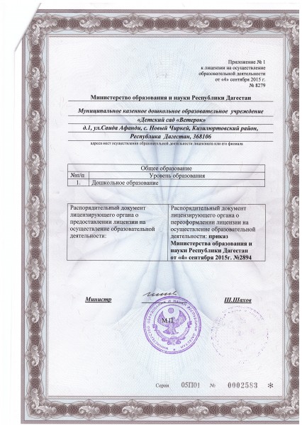 | Полное наименование образовательной организации* | Муниципальное Казенное Дошкольное Образовательное Учреждение Общеразвивающего вида детский сад "Ветерок" |