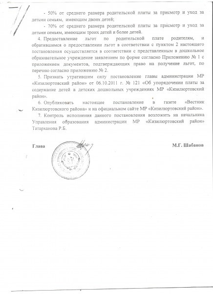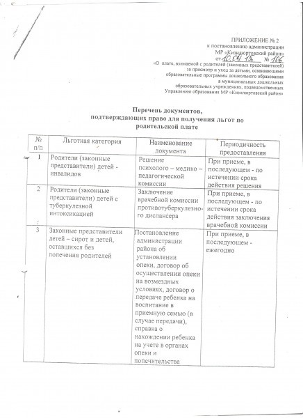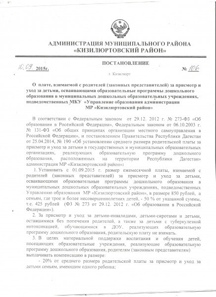 Документ об установлении размера платы, взимаемой с родителей (законных представителей)